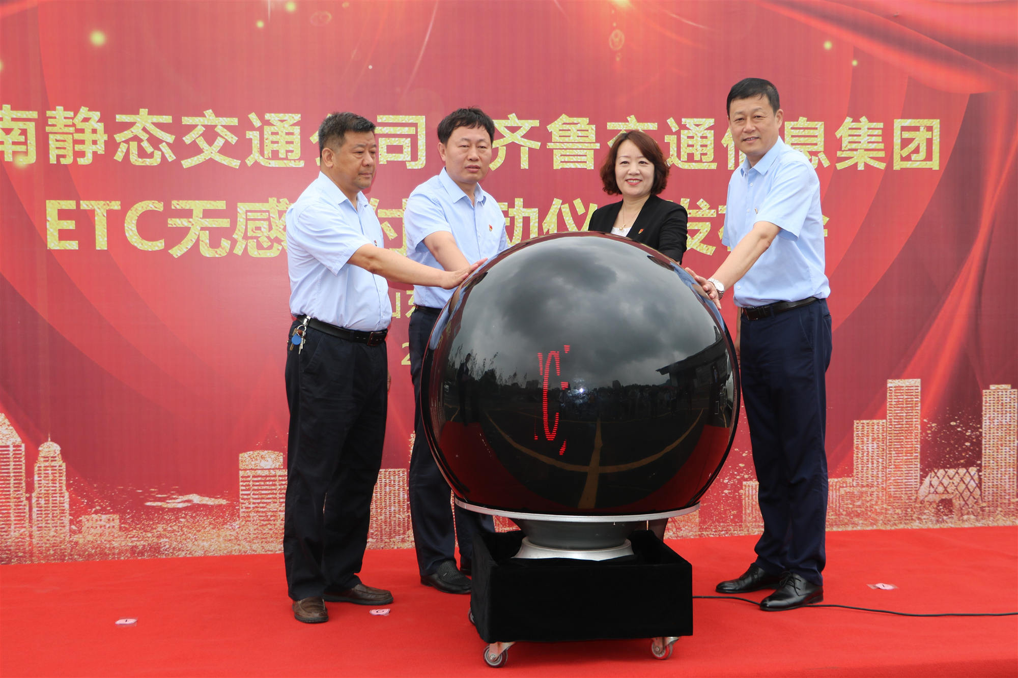 四位領(lǐng)導(dǎo)觸摸啟動(dòng)球,舜耕智能停車場(chǎng)ETC無(wú)感支付正式啟動(dòng)